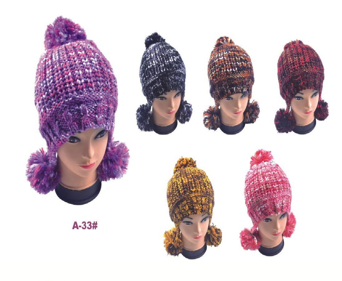 Ladies Winter Knit Acrylic Multi-Color Fashion Hats With 3 Pom Poms, Assorted Colors per dozen pack. - Price Per Dozen.