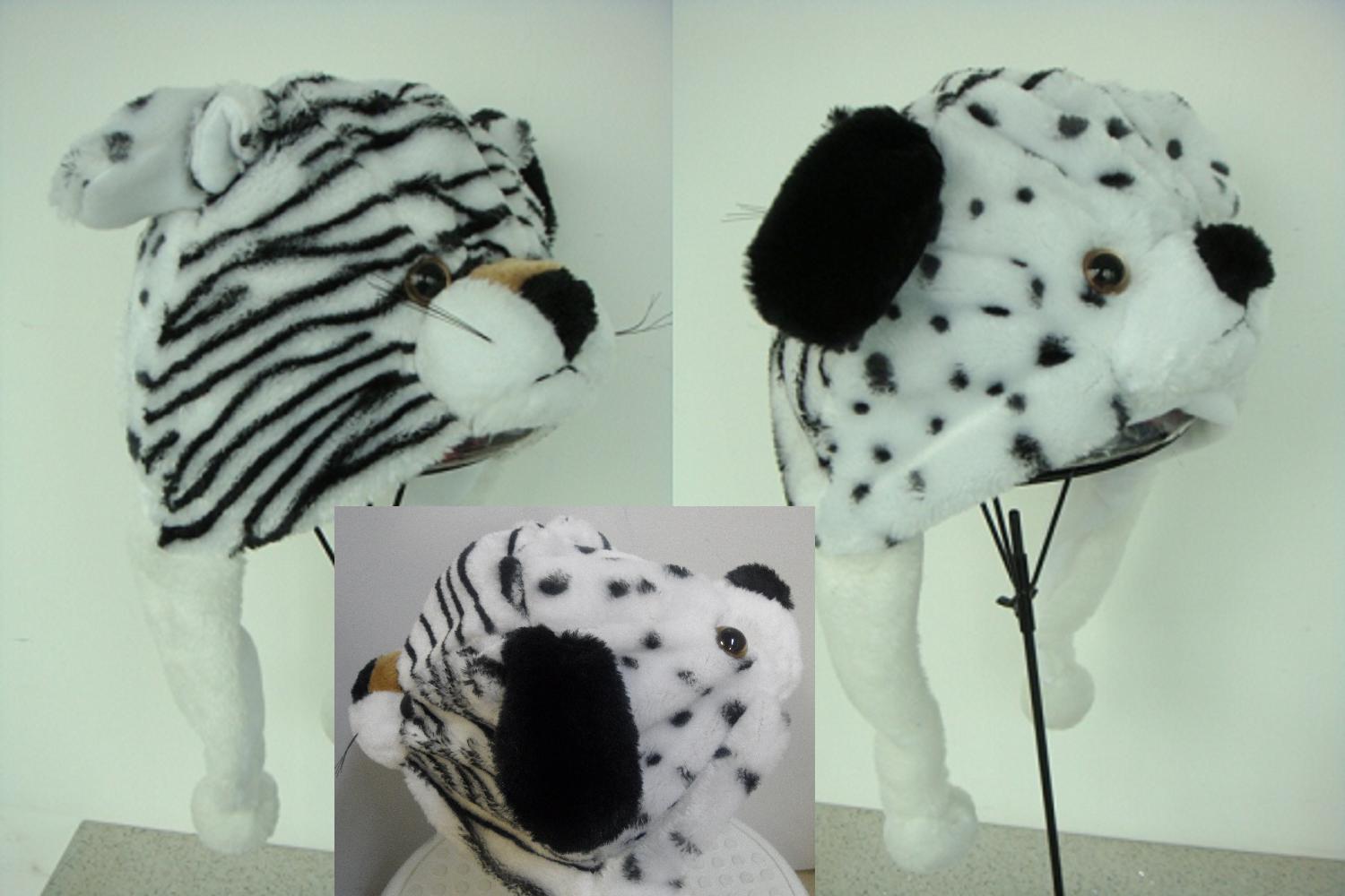 Faux Fur Double Faced Animal Hat: Tiger and Dalmation. Short Ear Flap w/ Fleece Lining. - PRICE PER 60 PC