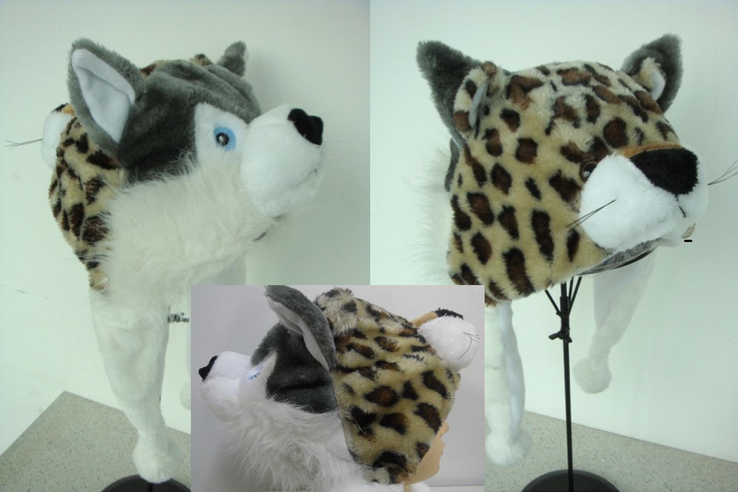 Faux Fur Double Faced Animal Hat: Jaguar and Wolf. Short Ear Flap w/ Fleece Lining. - PRICE PER 60 PC
