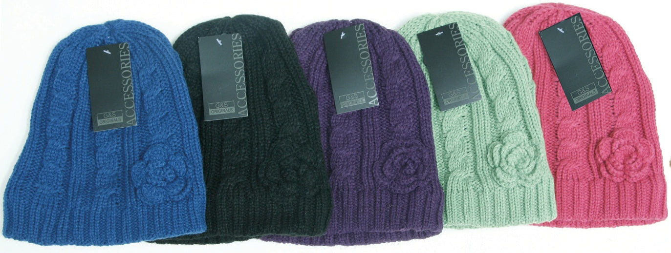 Ladies Cable Flower Designed Knit Hat With Fleece Lining - Price Per Dozen