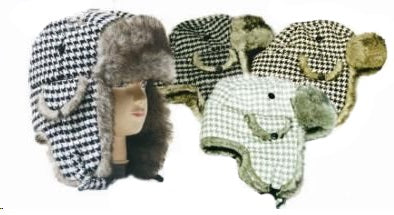 NEW!! Mini Houndstooth Aviator Hat w/ Faux Fur Lining. Colors: White, D. Grey, Brown, L. Grey. - Price per Dozen