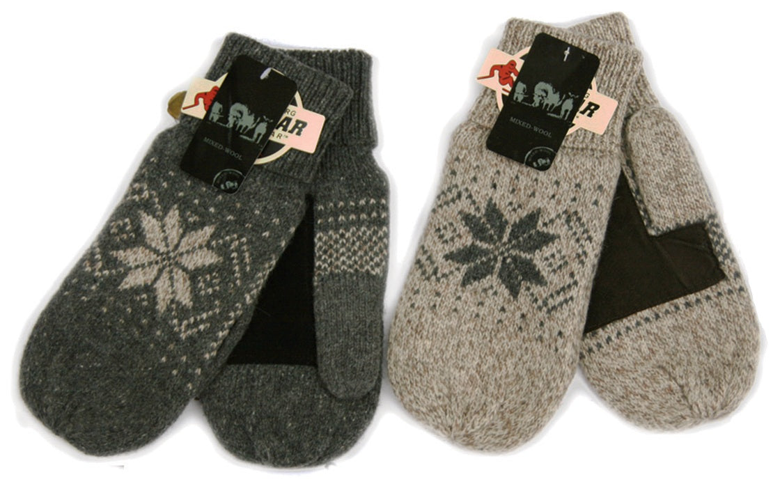 85% Wool Raggwool Mitten w/ Snowflake Design. Colors: Oatmeal and Charcoal. - Price Per Dozen.